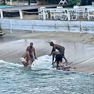 Dann bin ich durch den Ort gewandert und habe tatsächlich einen Bikini und ein par Schlappen erstanden, denn mit Turnschuhen ist es eher ungünstig am Strand. Jetzt kann ich wenigstens wie in einer alten Werbung für Kreditkarten aus dem Meer steigen und meine seitlich in die Bikinihose platzierte Plastikkarte wirkungsvoll auf den Tresen der Beachbar klacken lassen.