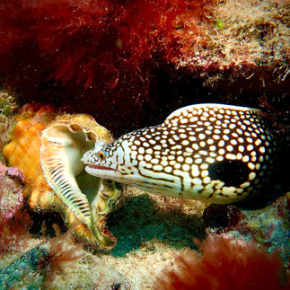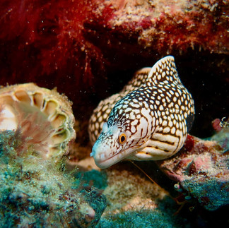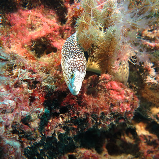 Auf der Rausfahrt war ich schon nach 10 Minuten seekrank. Mir war so was von schlecht. Wohlweislich hatte ich zum Frühstück nur eine Banane gegessen. Die ist mir zum Glück auch geblieben. Es waren noch 5 andere Taucher auf dem Boot heute, die allesamt ihres Frühstücks entledigt wurden. Leider ging’s denen danach auch nicht besser. Ich weiß zum Glück, dass es Unterwasser immer besser ist, aber bis dahin muss man auch erst mal kommen, denn bei extremer Strömung mussten wir wieder mehrere Bojen anfahren, um zu checken, ob dort Tauchen überhaupt möglich war. Endlich an einem Ziel angekommen, heißt es dann seekrank und wahrscheinlich Kermit- froschgrün im Gesicht das Equipment bei mega Wellen und Geschaukel anzulegen(Neoprenanzug hatten wir alle schon an, das würde gar nicht nicht anders auf dem Boot gehen). Ich war die Erste im Wasser ! Weil ich einfach auch reinmusste, sonst wär ich durchgedreht. Es war abgesprochen, falls die Strömung nicht zu stark ist, dass ich gleich am Seil abtauche und nicht erst auf die ganze Gruppe warten muss. Ahhhhhh, was eine Wohltat. Auf 5 Metern war es dann deutlich besser. Ich hab unten auf die anderen gewartet und wurde mit einem schönen Tauchgang belohnt. Ich habe nämlich eine Model-Muräne getroffen, die ewig vor meiner Linse posiert hat. Ich hatte das Gefühl, die konnte sich in der Linse selber sehen, denn sie hat sich von allen Seiten ganz nah und friedlich gezeigt. Normalerweise können Muränen extrem schlecht sehen. Man kann relativ nah an sie heran, aber wenn die magische Muränengrenze- und die kennen sie leider nur selber - unterschritten ist, beißen sie gerne mal. Das kann extrem unangenehm werden, nicht ob der Zähne selber wegen, sondern deren Bakterienbesatz, der dann ganz olle Infektionen machen kann. Zähneputzen ist in Muränenkreisen eher ungewöhnlich.